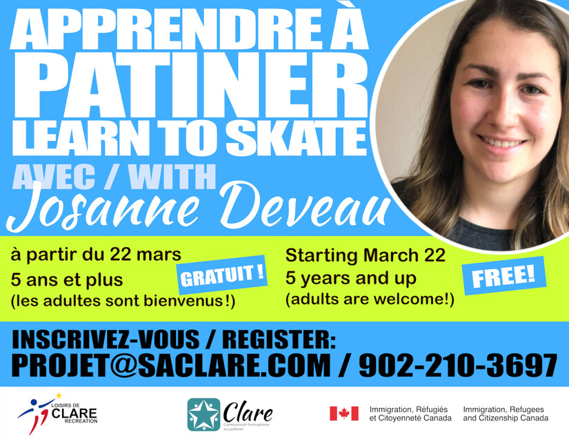 Have you ever wanted to learn how to skate? Communauté francophone accueillante de Clare and Loisirs de Clare - Clare Recreation have got you covered! Starting March 22, we’re teaming up with instructor Josanne Deveau to offer beginner skating lessons at the Clare community skating rink on Tuesdays from 5 to 6 p.m. These free sessions are open to residents 5 years and up – adults are welcome! Participants can borrow skates and helmets through the Municipality’s equipment loan program. Spaces are limited, so book your spot now! Contact Marc-Alexandre at This email address is being protected from spambots. You need JavaScript enabled to view it. or at 902-210-3697.