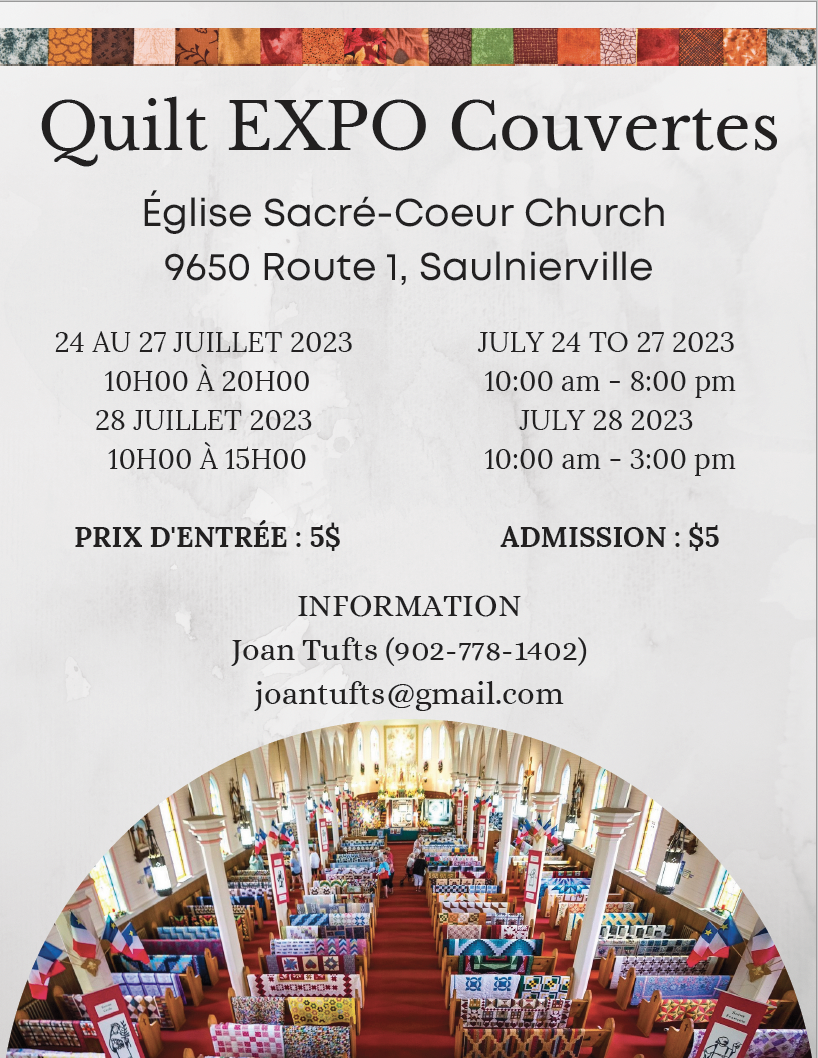 Expo-Couvertes will be back after a 4-year absence due to the pandemic. The Expo will run from Monday, July 24 to Friday, July 28 at Sacré-Coeur Church as usual. If you have pieces to show or offer for sale, please contact Joan Tufts at 902.778.1402 and she will tell you how to proceed.