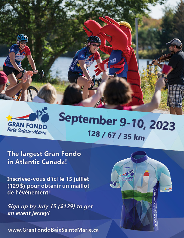The 6th edition of Gran Fondo Baie Sainte-Marie will be held on Sunday, September 10, 2023. Our Gran Fondo has quickly grown to become a bucket list 'must-do' cycling and cultural experience! As the largest cycling event in Atlantic Canada, we hosted 992 cyclists in 2019. Although a timed event, this is more of a self-paced FUN group event, rather than a race. Cyclists are encouraged to register early to participate in draws for a chance to win their registration or great prizes like a Gran Fondo duffle bag.