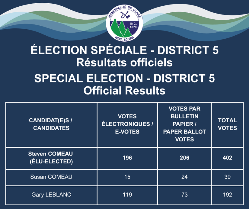 Petit-Ruisseau (N.-É.) - le 4 octobre 2025 : Après la fermeture du vote en ligne et des bureaux de vote à 19 h, les résultats non officiels de l'élection spéciale 2025 du district 5 sont les suivants :
