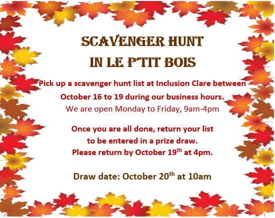 Procurez-vous une liste de chasse au trésor à Inclusion Clare entre le 16 et le 19 octobre, pendant nos heures d'ouverture.